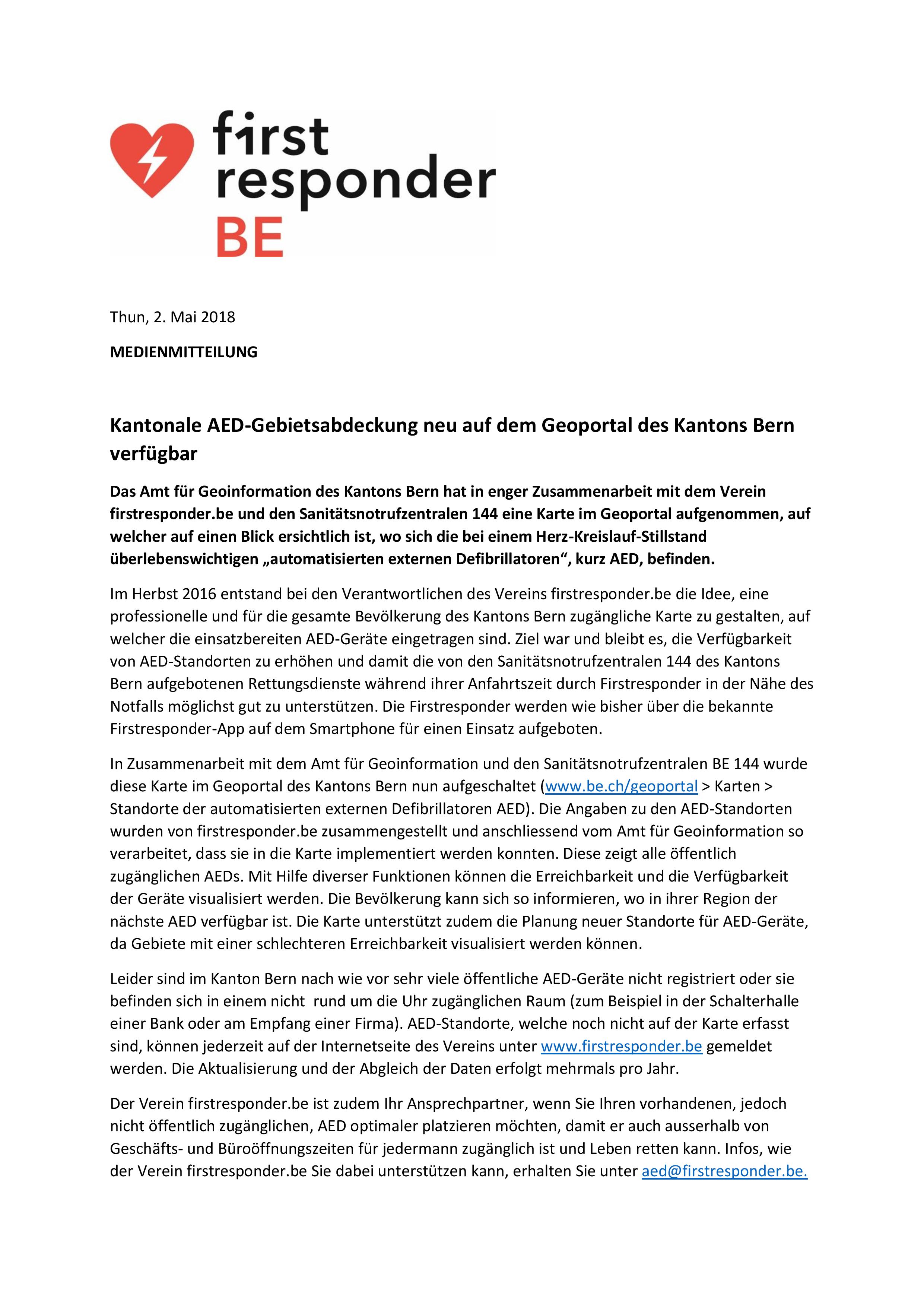 Das Amt für Geoinformation des Kantons Bern hat in enger Zusammenarbeit mit dem Verein firstresponder.be und den Sanitätsnotrufzentralen 144 eine Karte im Geoportal aufgenommen, auf welcher die Gebietsabdeckung durch die vorhandenen AED ersichtlich ist. Mit Hilfe dieser Karte lässt sich sehr einfach ablesen, welche Gebiete gut und relativ schwach mit öffentlich zugänglichen AED-Geräten abgedeckt sind.